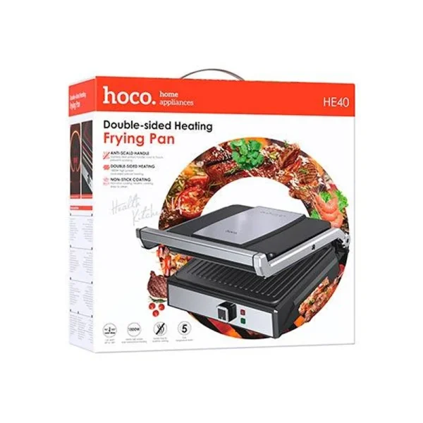 Hoco HE40 është një grill elektrik me ngrohje nga të dyja anët, fuqi 1800 W, 5 nivele temperature dhe pllaka me shtresë non-stick.